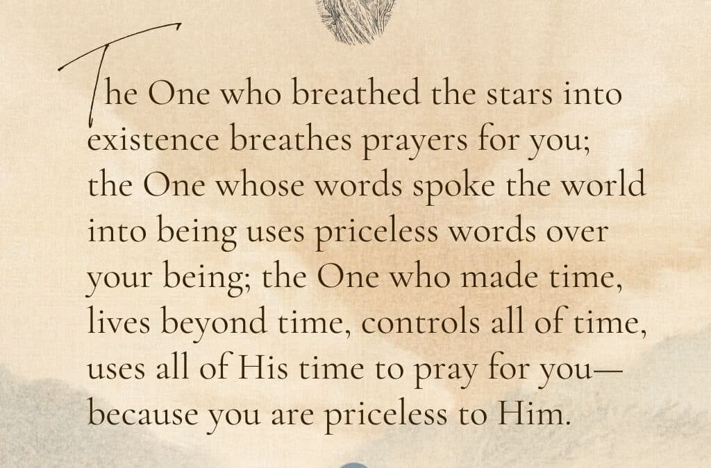 “The One who breathed the stars into existence breathes prayers for you; the One whose words spoke the world into being uses priceless words over your being; the One who made time, lives beyond time, controls all of time, uses all of His time to pray for you—because you are priceless to Him.”